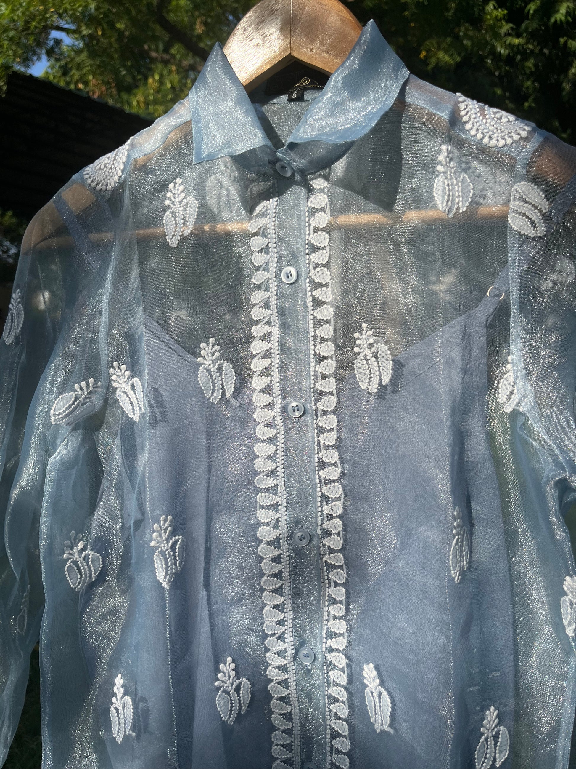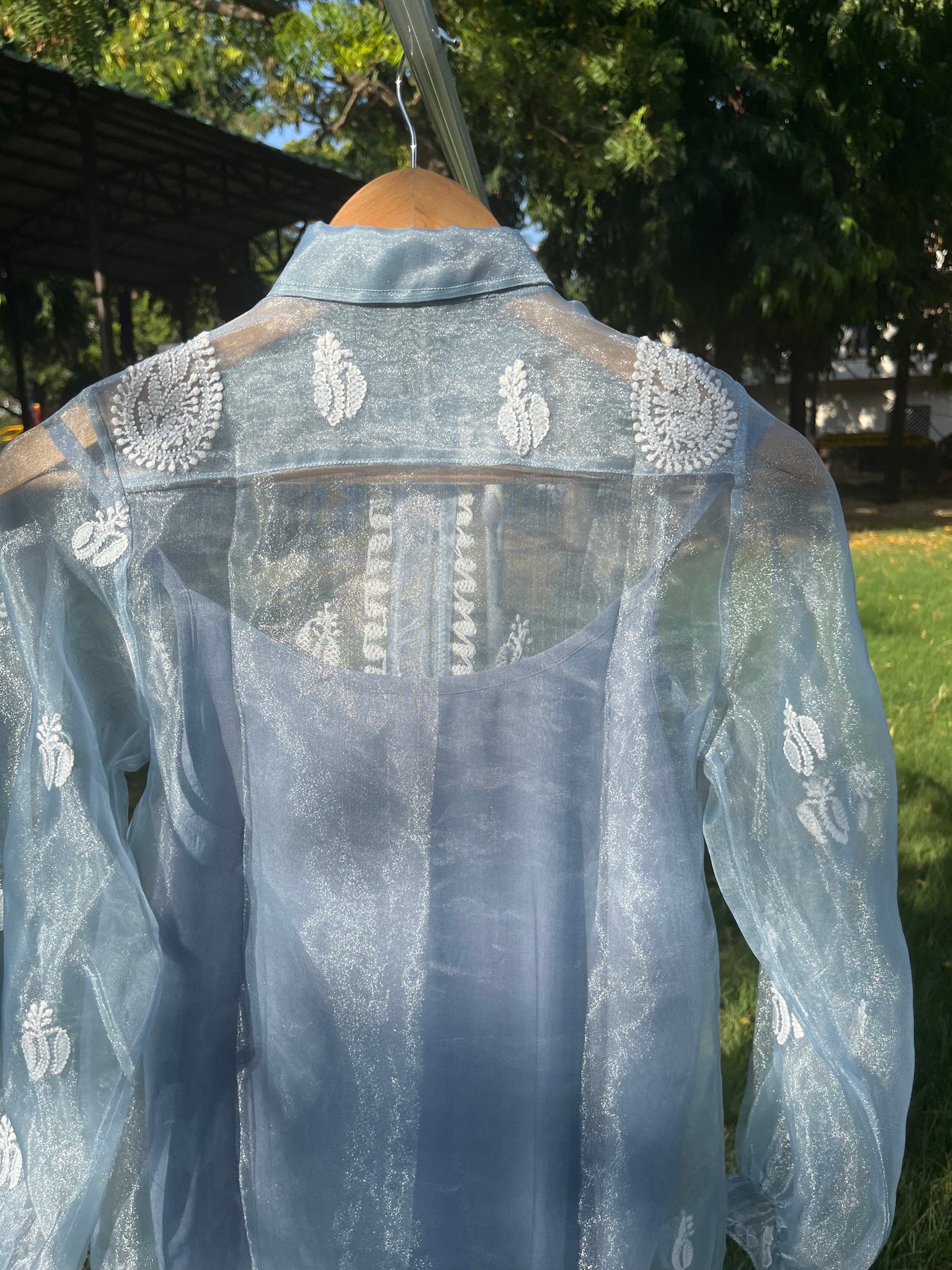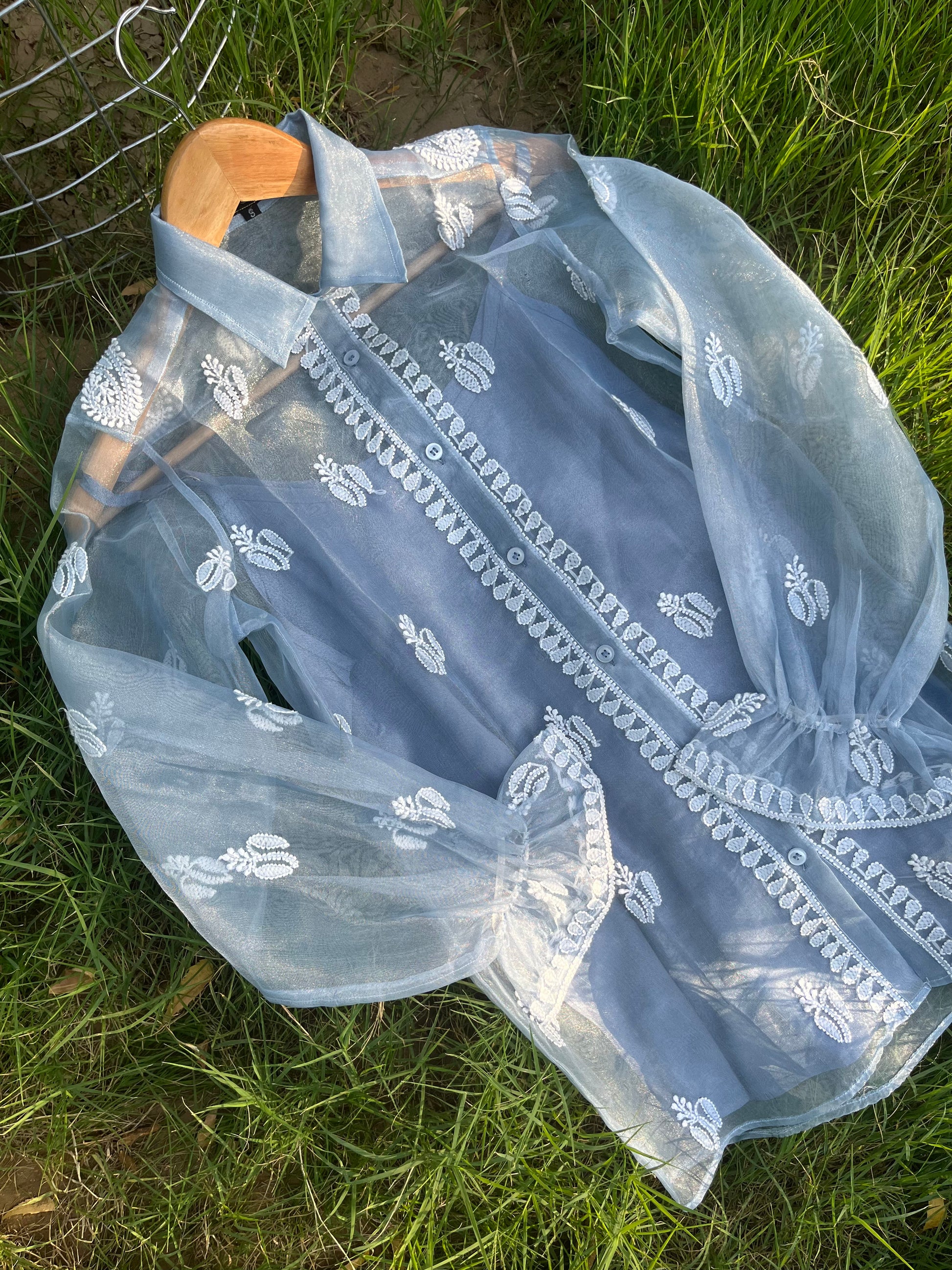 AASMANI is a beautiful and elegant powder blue colored organza shirt. It features delicate and intricate chikankari embroidery, carefully handcrafted in Lucknow. Perfect for festive and party wear, AASMANI is sure to bring you compliments.