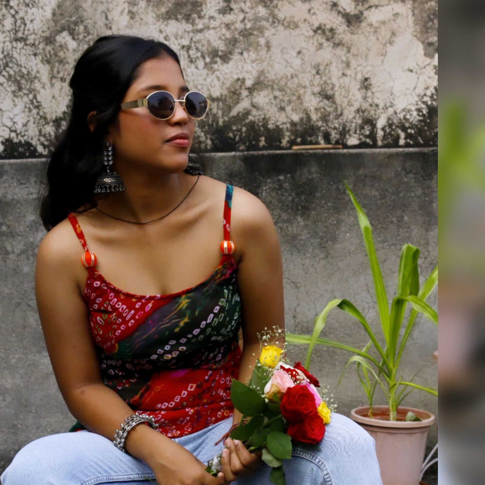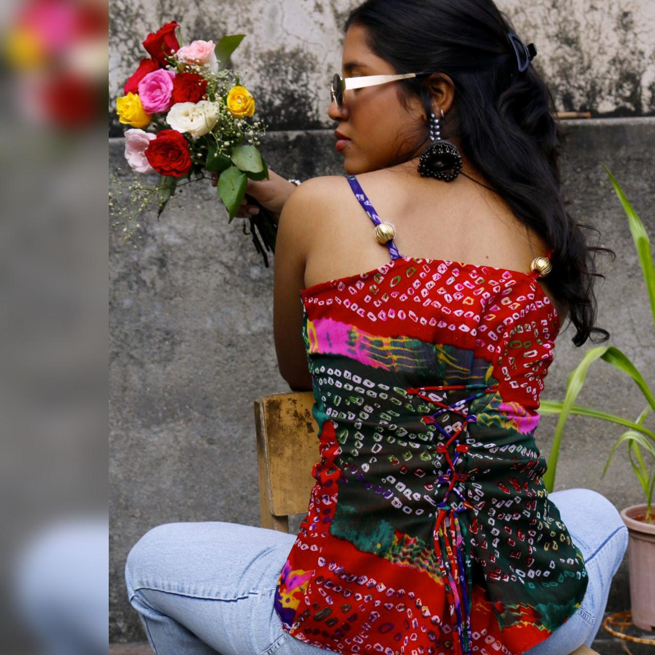 This playful Bandhani cami top features a charming corset tie-up back that lets you adjust the fit to your style. Its vibrant traditional print adds a splash of color, while the lightweight fabric keeps you cool and comfortable all day. Perfect for pairing with your favorite jeans or skirts for a flirty, fun look!