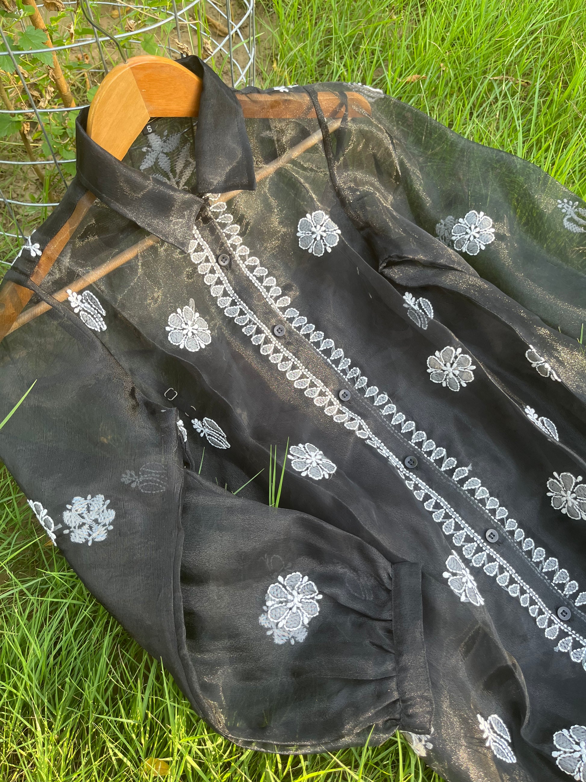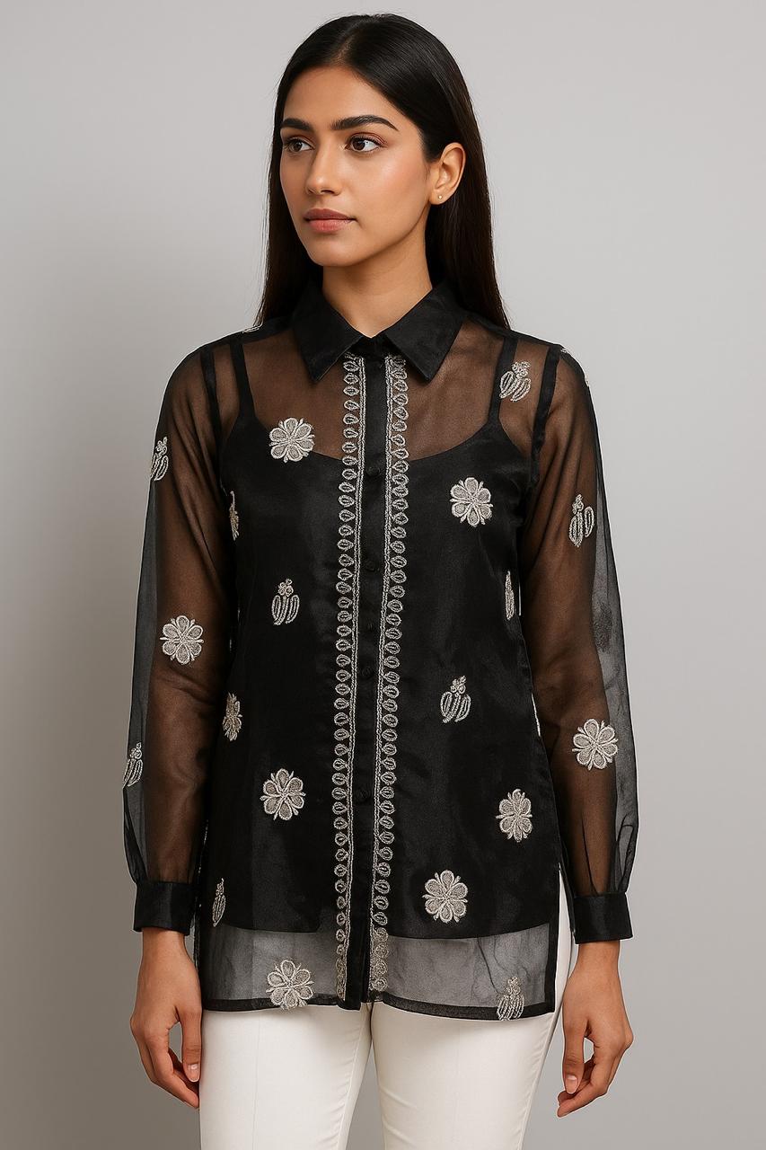 Ebony is a black coloured chikankari embroidery shirt crafted with an exquisite organza fabric. This delicate and airy shirt offers a comfortable fit and will add sophistication to any look.